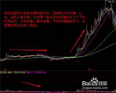 构筑底部形态的成交量明显变化。低部形态有多种。比如,w形,三重底形。这种票一般在低成交量的水平之下长时间运行,升时放量,跌时缩量。平时的振幅也不大。这需要投资者有耐心等待。