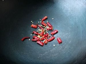 把辣椒和花粒放入炒锅里小火慢慢炒香,炒至微黄后盛出放凉。