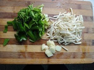 野芫荽和野韭菜根洗净切段,蒜去皮备用。