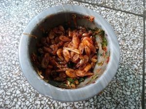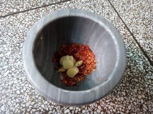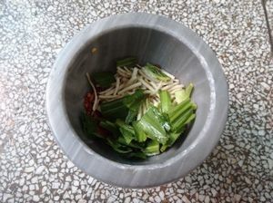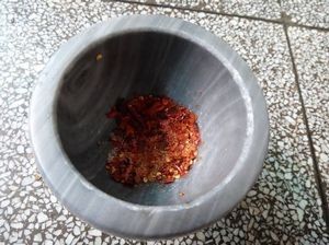 把煸香的辣椒、花椒放入蒜臼里,并放入适量盐捣碎。