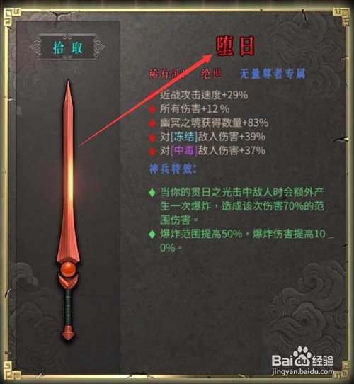 第四件是堕日,无量尊者专属,神兵特效当你的贯日之光击中敌人时会额外产生—次爆炸,造成该次伤害70%的范围伤害。爆炸范围提高50%,爆炸伤害提高100%。