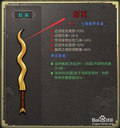 第二件是幻灭,是七剑修罗专属,神兵特效当你触发[冷血]时﹐[剑返]冷却时间减少1秒。当你的[剑返]处于冷却状态时·你的所有伤害提高50%。