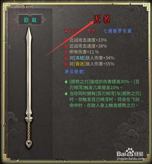 第一件是无名,是七剑修罗专属,神兵特效[顺势之刃]造成的伤害提高30%,[百刃倾泻]触发几率提高10%。当你同时拥有[百刃倾泻]与[顺势之刃]时,你触发百刃倾泻时,将会在飞剑命中时·在敌人身上触发顺势之刃。