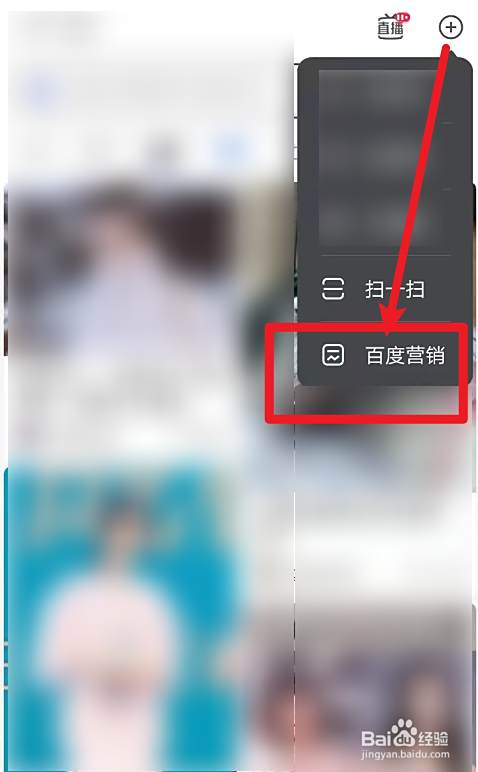 然后在首页点击右上方的加号,在弹出的窗口点击百度营销进入;
