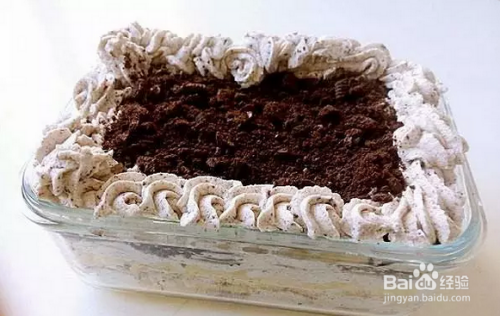 组装起来,一层奶油一层奥利奥,铺满,然后放冰箱冷藏2小时