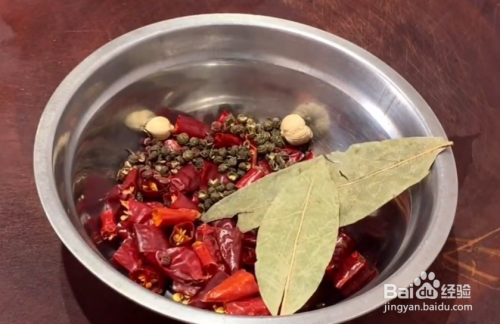 接着准备香料,碗中放入少许辣椒段、花椒、香叶、茴香,用水进行清洗后备用