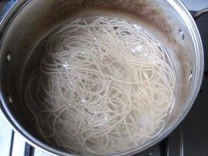 粉条放入开水中煮软,捞出浸泡在凉水中防止粘连,然后切碎。