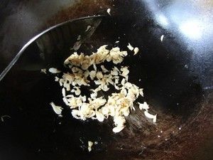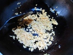 热油中下入打散的鸡蛋,炒熟并用铲子铲成小块