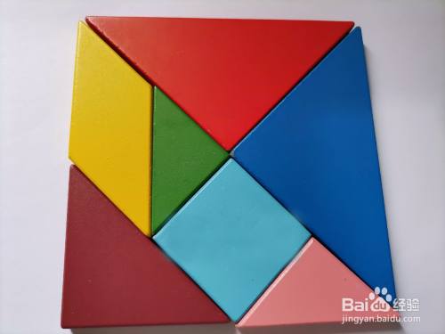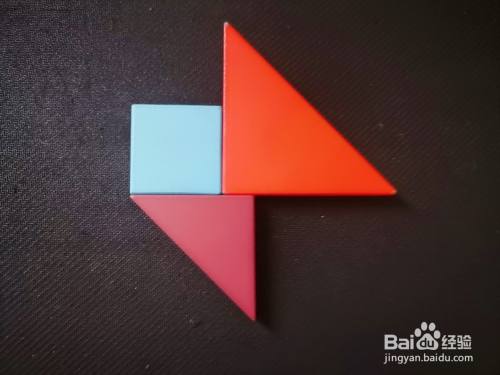 拿出一个粉色小三角形放在天蓝色正方形的左边,如下图所示。
