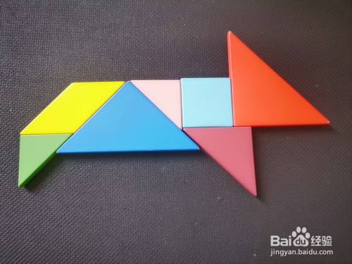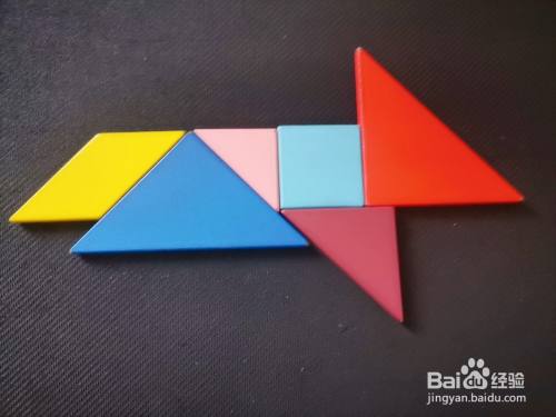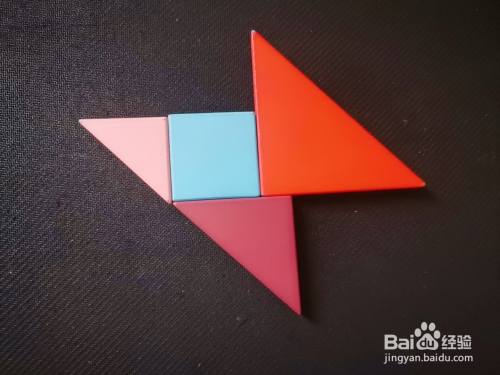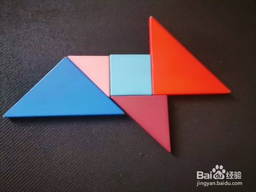 拿出一个深蓝色大三角形放在粉色小三角形的左边,如下图所示。