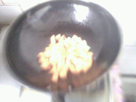 锅中倒入香油,小火,待油热放入葱段爆香!