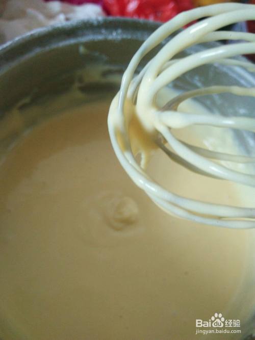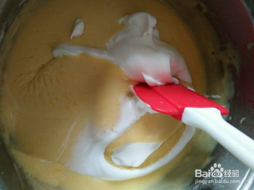 把打发好的蛋白分三或四次加入奶酪底,像炒菜一样翻转,一定要记得不要搅拌哦!!