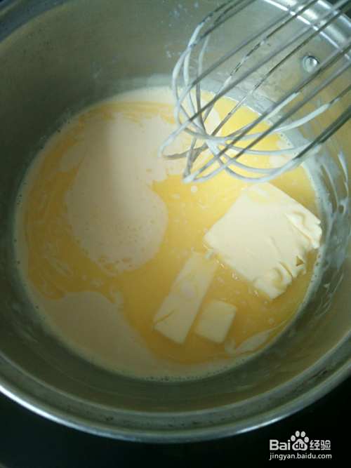 隔水把牛奶和奶酪搅拌柔顺无颗粒后加入黄油。(记得要把黄油和牛奶奶酪搅拌均匀无油星)