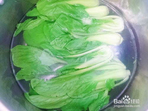 4:锅中注水烧沸,撒一勺盐滴两滴油,把油菜倒进去焯两分钟。