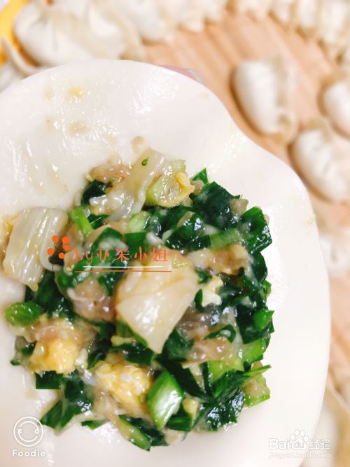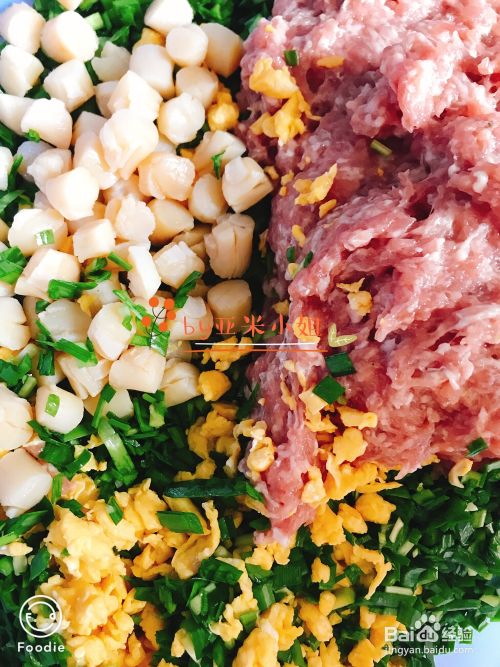 用蒸煮机打洋葱、姜汁,倒入肉馅,分三次倒入扇贝汁,顺时针打至被肉馅吸收。在韭菜中加入玉米油,拌匀,让韭菜受油膜保护,使韭菜不出水,饺子嫩多汁,然后加入盐、白胡椒、芝麻油、蚝油,加入扇贝和熟鸡蛋,拌匀。