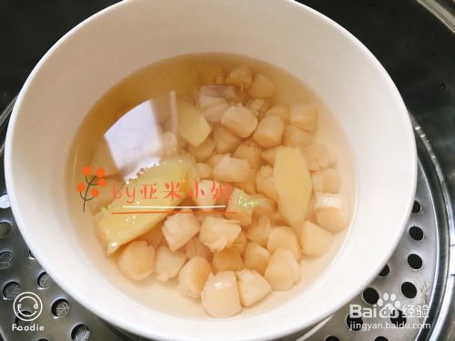 干贝、干贝洗净砂子,将雕刻品、姜片、清水放入碗中,放入锅中蒸1小时