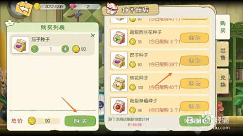 在打开的种子店中,添加茄子种子,在左侧的购买清单中,支付90金币,点击购买即可一粒茄子种子。