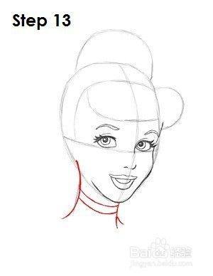 第十三步:使灰姑娘颈部的两条线变暗,并在底部略微向外弯曲。在脖子右侧画一条小线,表示她肩膀的开始。在灰姑娘的脖子里面,画两条曲线代表她的项链。