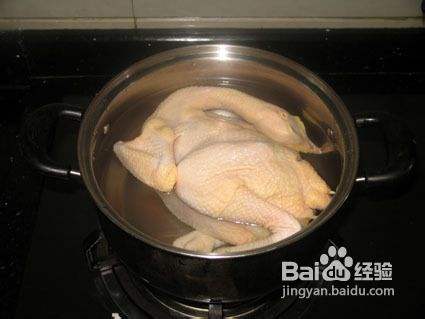 3冷水将鸡入锅,烧开后撇去浮沫。