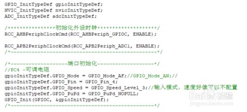 第一步:配置相关的AD端口为模拟或者复用输入,一般AD选模拟输入比较好,当然对于STM32F051选复用(GPIO_Mode_AF)貌似也是可以的。