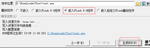 最后再确认单选框选中了“嵌入Flash 9.0控件”,再点击“生成exe”按钮