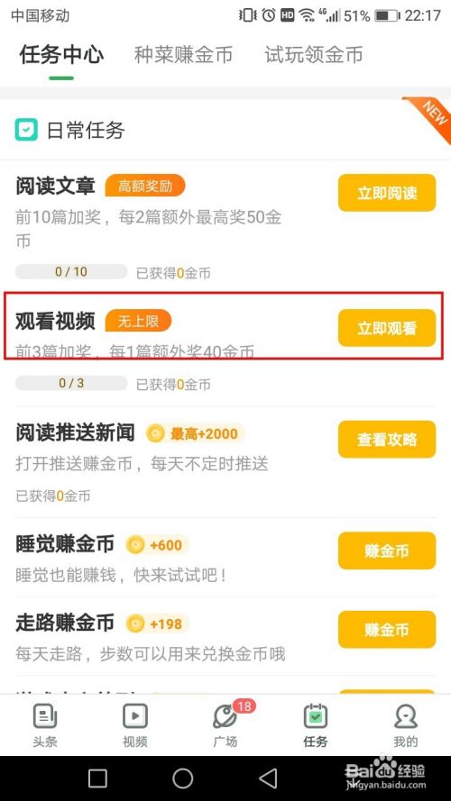 我们可以通过观看视频领取金币,点击“立即观看”。