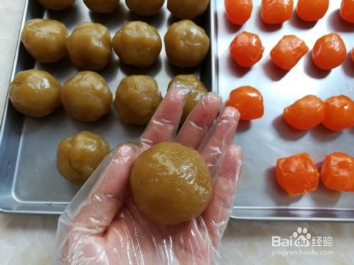 白莲蓉按照每个40克,平均分成16个,每个包一个咸蛋黄月饼皮按照每个25克平均分成16个