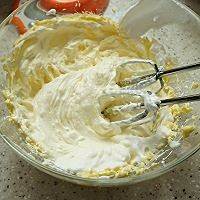 将打发好的蛋白加入黄油中,分2-3次,用打蛋器低速打。