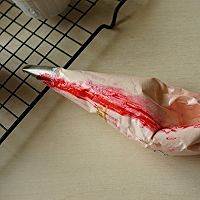把用色素调过颜色后的意式奶油霜装入裱花袋,想要如图的效果,用刷子在裱花袋的一侧刷上少量色素。
