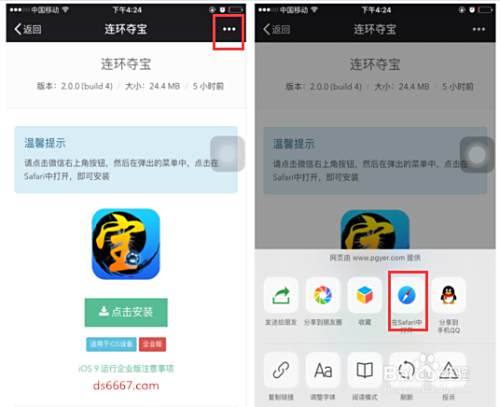 点击官网首页的游戏下载,进入游戏下载页面,选择并点击苹果iOS 9系统游戏,用手机微信的扫一扫扫描网站页面里的二维码,点击手机微信的右上角选择用Safari打开