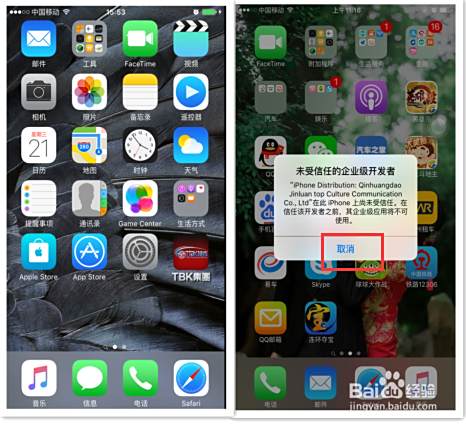 由于苹果 iOS9版本中升级了证书信任机制, 如果您的设备是iOS9版本, 在首次安装应用时, 需要对证书进行一个信任的操作。打开iOS设备上的应用时提示“未受信任的企业级开发者”, 记住弹窗的英文名称,并选择取消