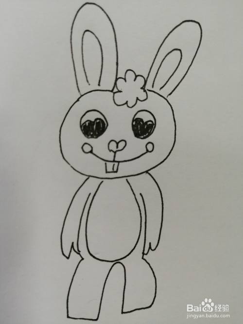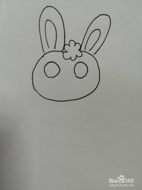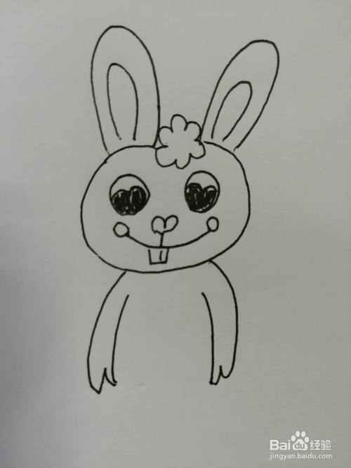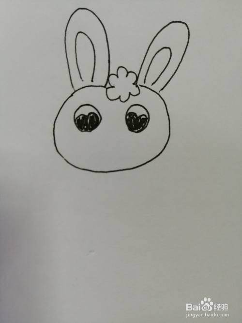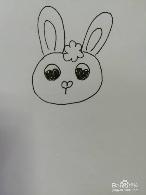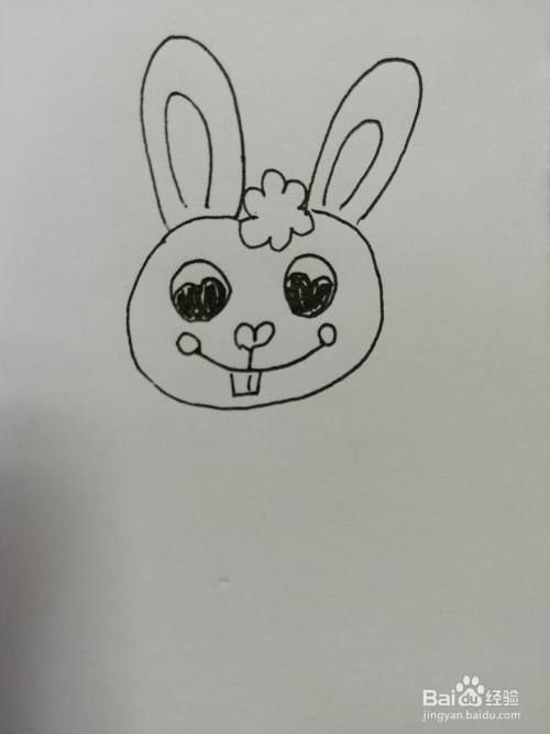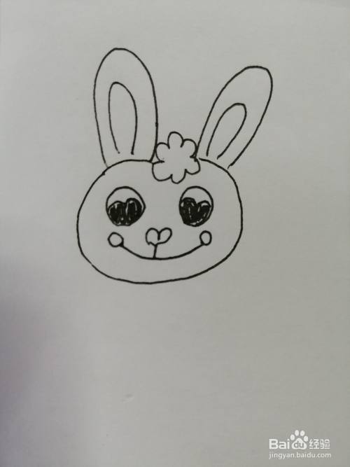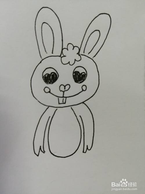 第四步,在可爱的小兔子的两只黑色眼睛下面画出鼻子和微笑的嘴巴,嘴巴的弧度比较大。