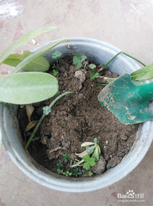 将泥土装入花盆中,取适量水润湿泥土。用铁铲松泥土。如下图所示。