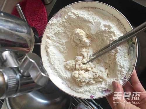 1200克面粉放在盘子里,打开自来水流小水流,同时搅动筷子搅拌
