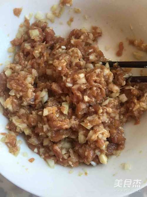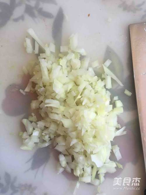 7切好的圆葱加入肉馅中,拌匀。