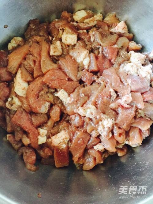 13分肥7分瘦猪肉切小块,加入所有调料搅拌均匀,放阴凉处腌制一天