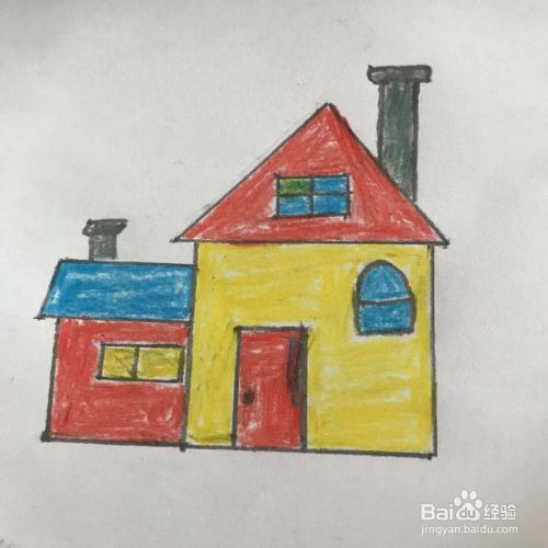 给大房子和小房子的上方分别画上一个烟囱,然后再给房子涂上漂亮的颜色就可以了,见下图