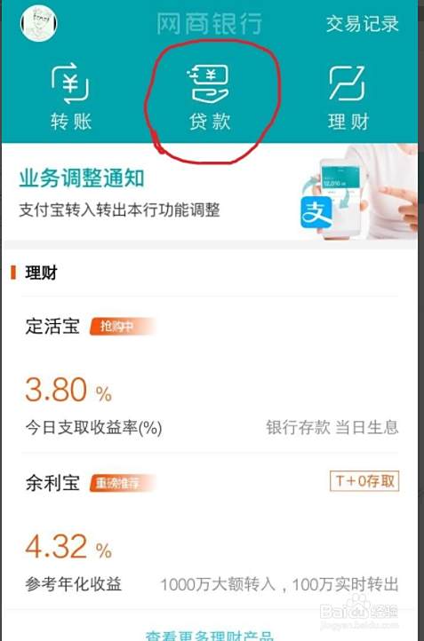 登录成功后,我们可以看到页面上面中间有一个“贷款”按钮,点击进入。