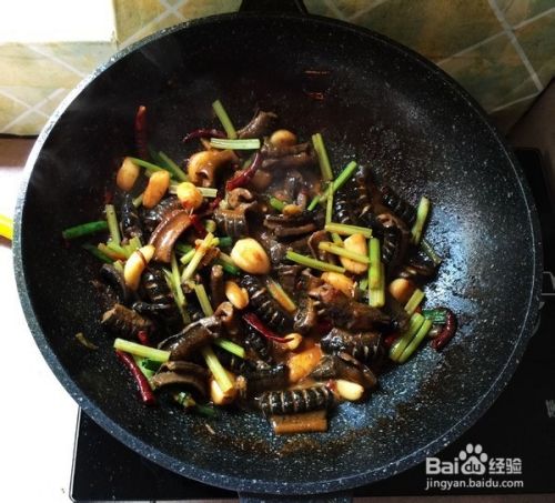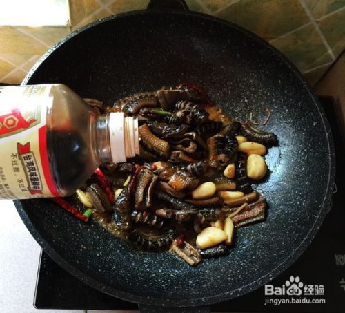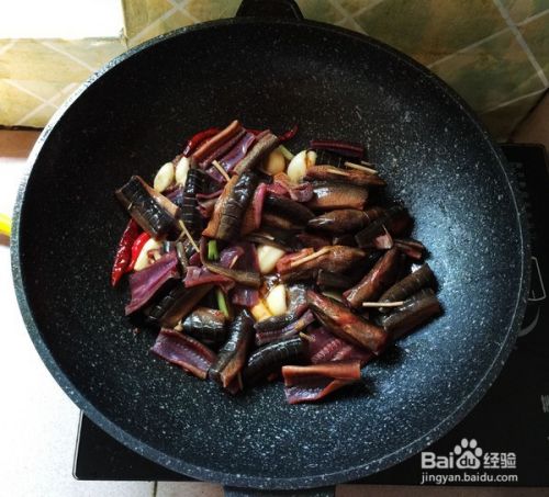 快速,不停的翻炒约2分钟左右,黄鳝肉微微发白时,淋入料酒,进一步除腥气。