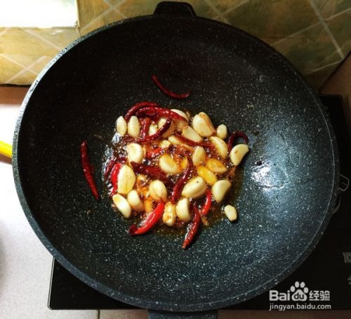 炒锅中倒入食用油,先下大蒜,花椒,干辣椒,中小火炸出香味。