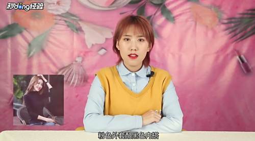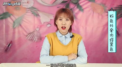 1粉色外套内搭黑包。