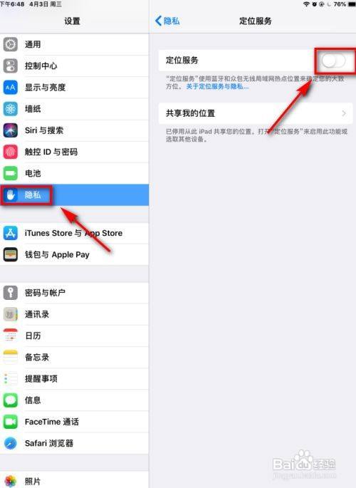 左侧栏点击隐私,右侧栏找到定位服务旁边的按钮,点击打开定位服务。