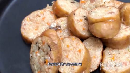 把准备好的馅料放入到大肠里面,把大肠放入到锅中蒸半个小时,用牙签扎眼孔排气,把大肠放入到锅中炸一下,炸好后切片装入盘中即可。