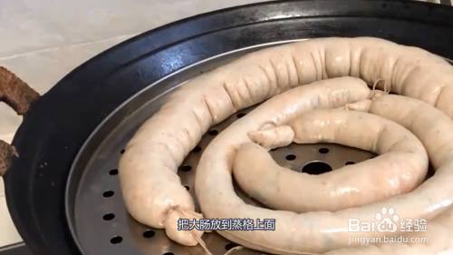 把大肠放到蒸格上面,开火蒸半个小时的时间,时间到后用牙签在上面扎眼排气。