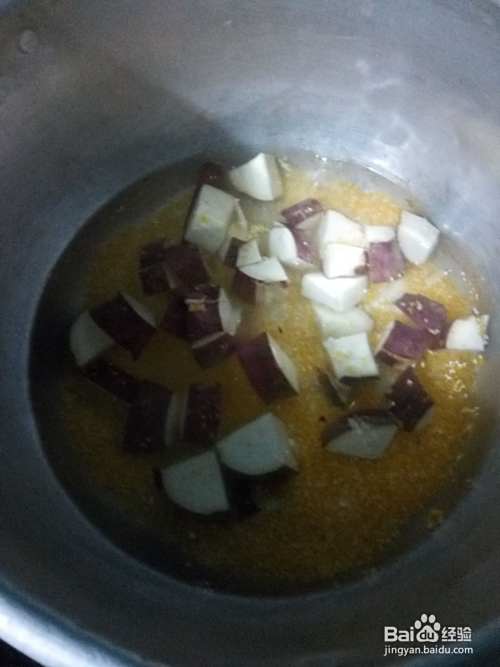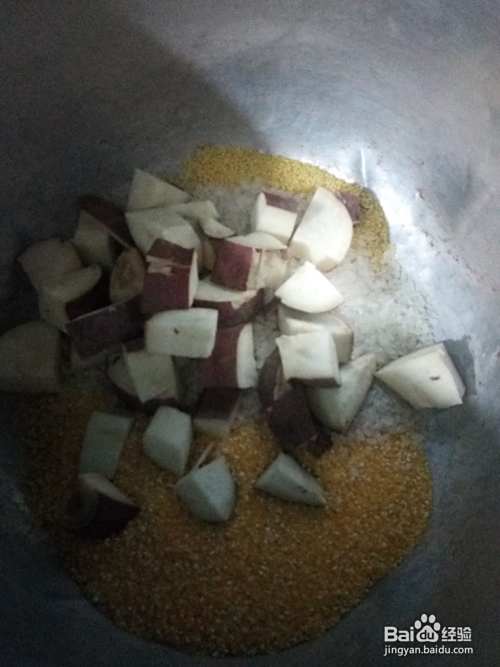 再将大米,小米,小碴子,地瓜块,都放入锅里。