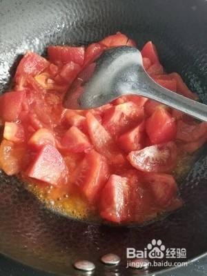 锅内倒入少许油,放入葱花炒香,放入西红柿翻炒2分钟。