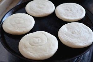 开火热锅(我喜欢用铸铁锅烙饼),锅里不放油,直接放饼两面烙出金黄的花纹。