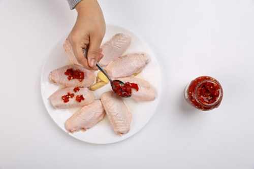 3剁椒鸡翅,鸡翅洗净,抹一下盐,料酒腌制一下10分钟,剁椒涂抹在鸡翅上。