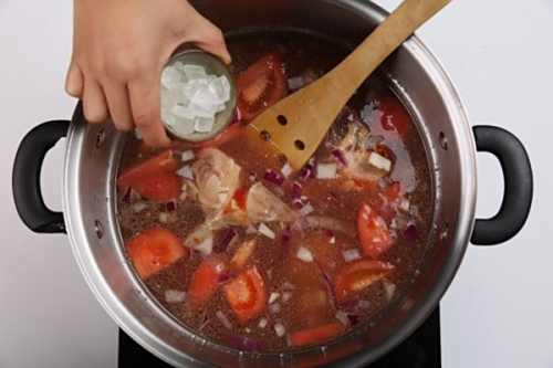 4最底层,可以做番茄牛骨汤。慢炖。先热锅,放入少许食用油,加入洋葱丁爆香,放入番茄块,牛骨,加入料酒、冰糖、盐、鸡精调味。煮开后,转中小火。放上隔层,第二层放入鸡翅。