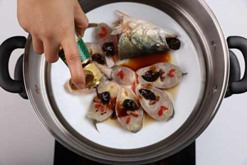 5使用另一蒸屉,鱼露蒸鲈鱼,鲈鱼洗净后,切块,倒入料酒、鱼露调味,放上蜜枣和枸杞。
